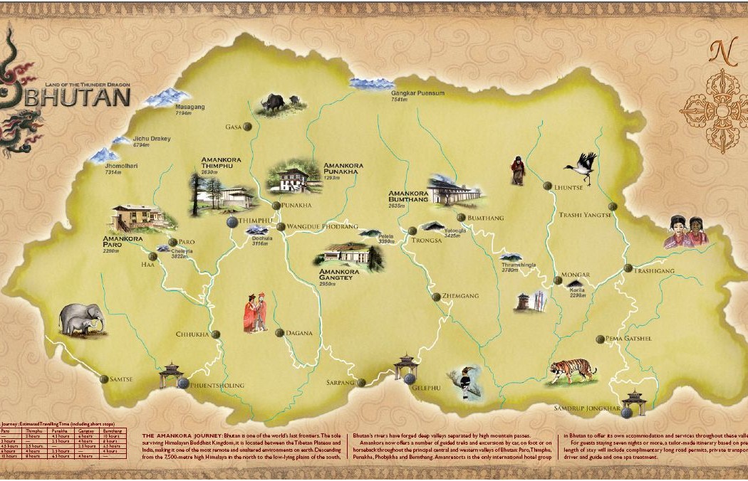 Gibt es dieses Paradies, genannt Shangri-La, wirklich? Falls ja, könnte es durchaus in Bhutan sein. Bhutan, das von seinen Bewohnern Druk Yül (Land des Donnerdrachens) genannt wird, gehört zu den lebendigen Beispielen einer intakten Kultur und Umwelt. Verborgen im östlichen Himalaya und zwischen zwei mächtigen Nachbarn (Indien und Tibet/China) gelegen, etwas grösser als die Schweiz, aber mit einer viel kleineren Bevölkerungsdichte, ist Bhutan «das Land, das einen magischen Charme verströmt», wie seine Verehrer sagen. Die Schönheit der Landschaft erscheint für den Besucher aus der industrialisierten Welt manchmal unwirklich: Häuser mit kunstvoll geschnitzten Fensterrahmen und Schindeldächern, Patchwork von grünen Reisfeldern, dichte Eichenwälder, Parzellen mit goldfarbenem Buchweizen, gedeckte Holzbrücken, Zäune aus kunstvoll geflochtenem Bambus, Frauen, die unter freiem Himmel Textilien weben, Pferdekarawanen mit Nachschub für abgelegene Orte, durchs Gehölz von riesigem Rhododendron streifende Yaks. Solche Begegnungen und Erlebnisse sind bleibende Erinnerungen. Die tiefsten Eindrücke jedoch hinterlassen die Symbole des religiösen Lebens in Bhutan: Über die Landschaft verteilte Chörten, im Wind wehende Gebetsfahnen, von Gebirgsbächen angetriebene grosse Gebetsmühlen, die Tempel und natürlich die Wahrzeichen von Bhutan: die Dzongs, Klosterburgen, die an strategisch wichtigen Orten erbaut wurden. Der Buddhismus ist allgegenwärtig, das tägliche Leben und die Geisteshaltung bestimmend.