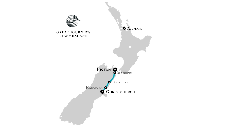 Die Fahrt mit dem Coastal Pacific führt Sie auf einer Strecke von rund 350 km von Christchurch, der grössten Stadt auf der Südinsel, in das beschauliche Picton, Tor zu den malerischen Marlborough Sounds. Während der Fahrt lassen sich die Küste und die Kaikoura-Ranges hervorragend bestaunen. Während der etwa 5-stündigen Reise durchfahren Sie fast zwei Dutzend Tunnel und 175 Brücken. Der Zug ist mit komfortablen Panoramawagen und einer Cafeteria für Ihr leibliches Wohl ausgestattet.
